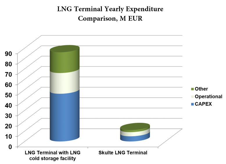 Kopējās Skultes termināļa izbūves izmaksas ir salīdzināmas ar Klaipēdas LNG termināļa 1 gada izmaksu budžetu. Skultes LNG termināļa operatīvās izmaksas tiek plānotas astoņas reizes zemākas nekā Klaipēdā.